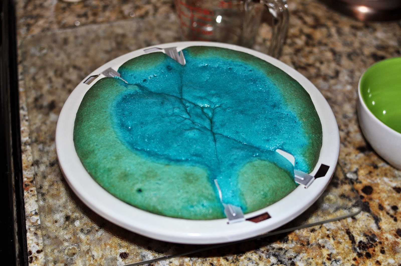 I had been working on my cake for about an hour when I noticed the first crack. It was on the bottom half of the cake near where my fondant fish scales started. I was a little worried, make that a lot worried. I stuck some long wooden skewers into the cake, and hoped for the best. I also noticed that the cake seemed flatter than it was earlier. It no longer had that round soccer ball shape. It looked like a ball that saw slowly losing air.