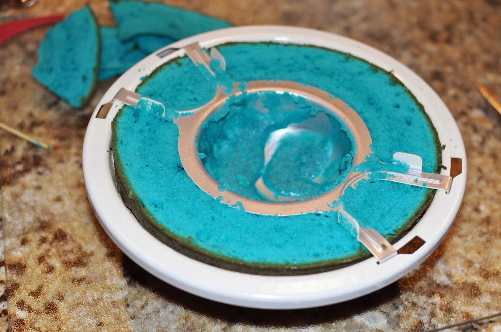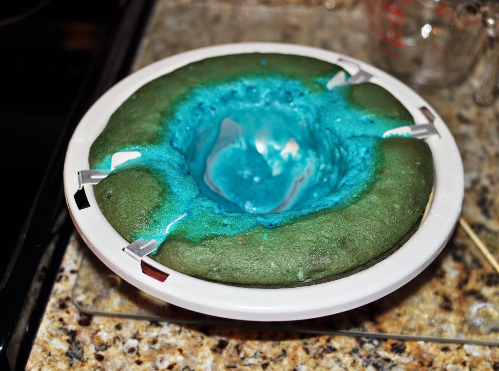 The instructions that come with the cake pan said to fill the pan 3/4 full. I put ALL the batter into the pan and decided it looked about 3/4 full. I was very scientific about my measurements. Into the oven it goes, and about 25 minutes into the baking cycle I checked the cake. Oh the horror that greeted my unsuspecting eyes.