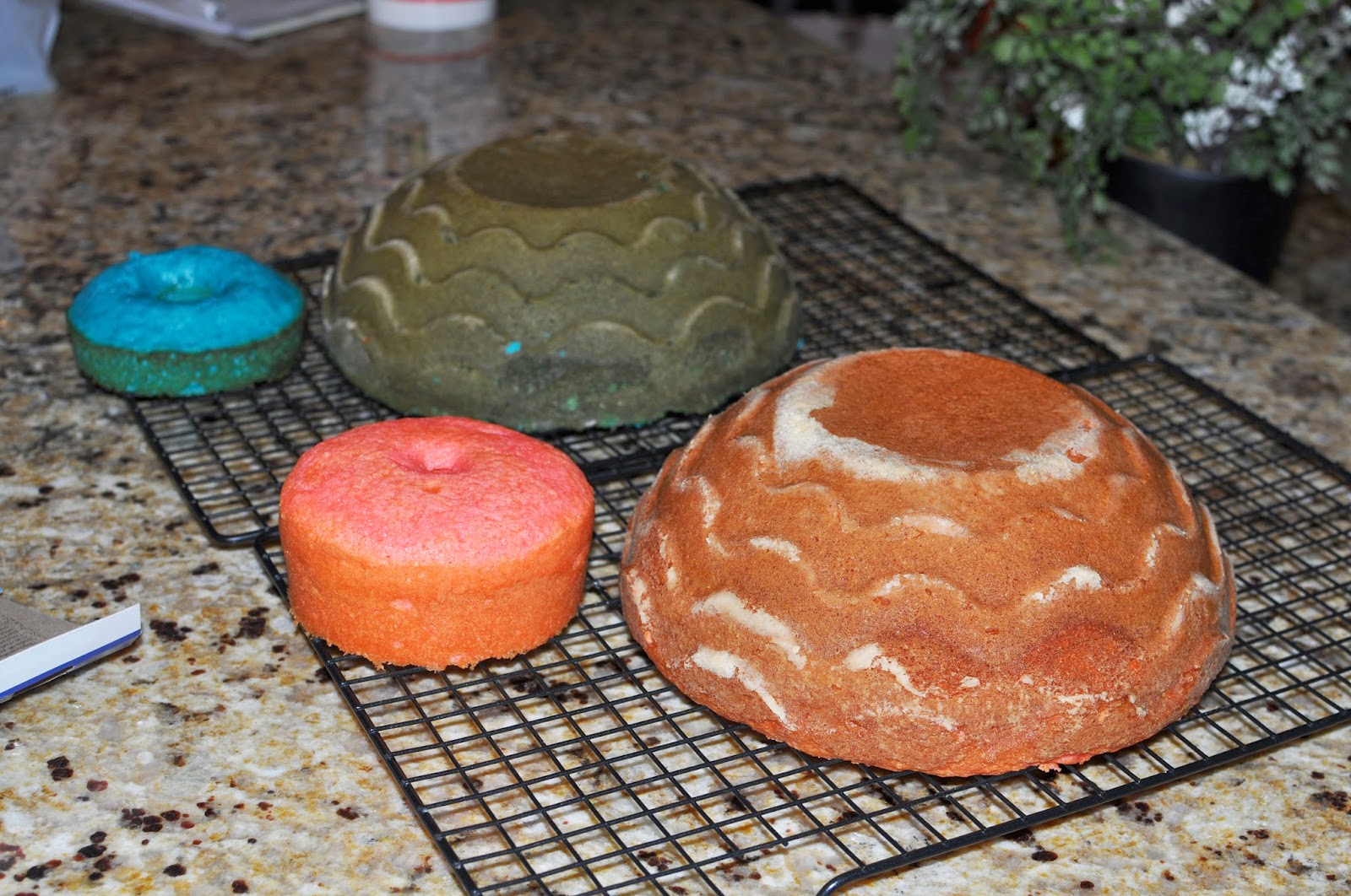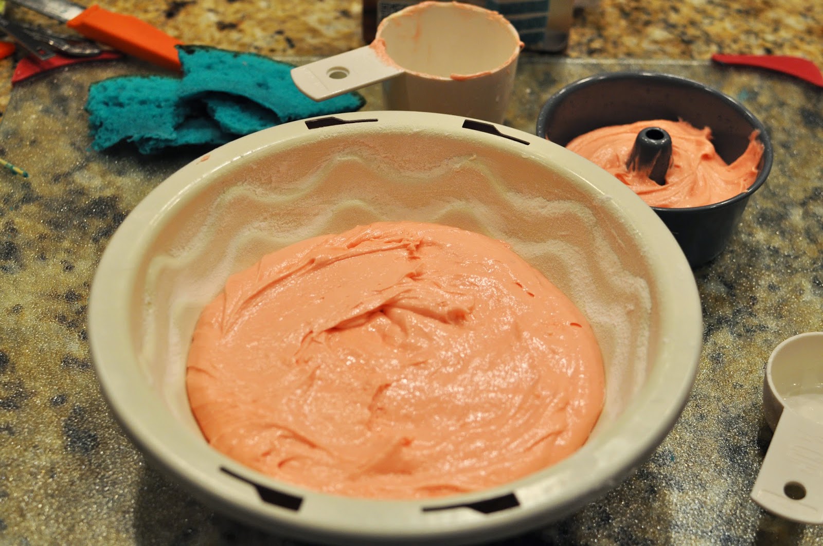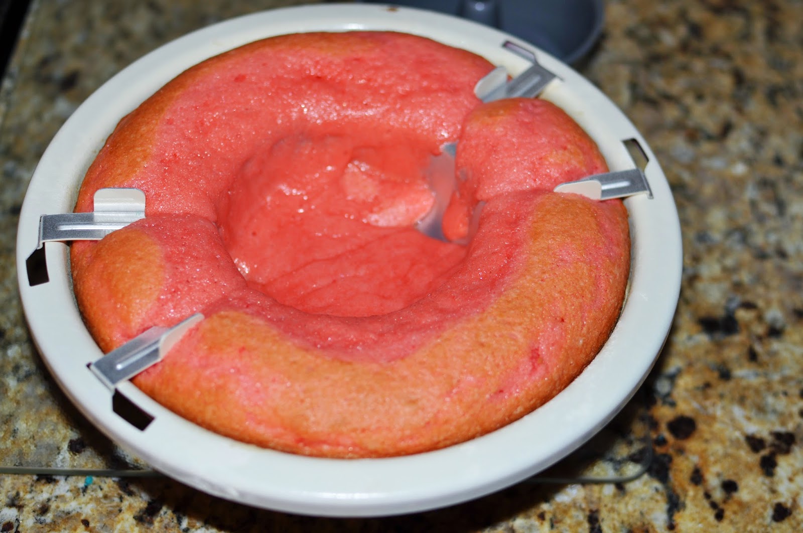 The half-baked batter had bubbled up and filled the inverted mini-dome of the pan. I took the cake out of the oven, scooped the still liquid batter out of the mini-dome, and put the cake back into the oven.