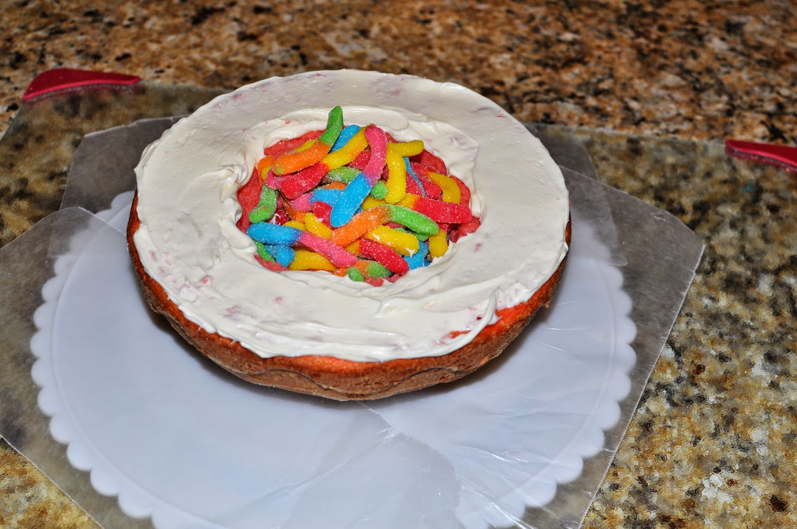 I frosted the seam of the bottom cake, and filled the cavity with gummy worms. Why gummy worms? I figured this was going to be a fish cake, and what is inside the belly of a fish???? Well worms of course. I don’t know if my creative genius is cute or disgusting.