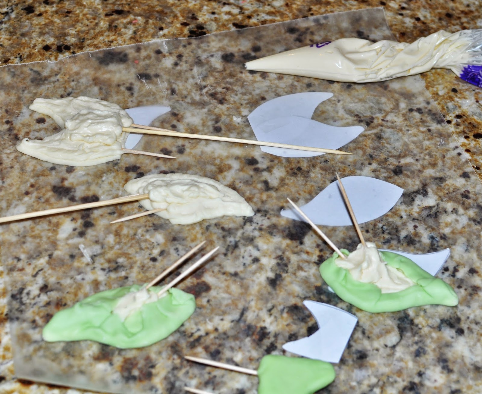 Next I made some fish body parts (fins, tail, mouth, eyes) out of white chocolate. I just formed them free hand, embedded long wooden skewers into the melted chocolate, and let them set overnight. The